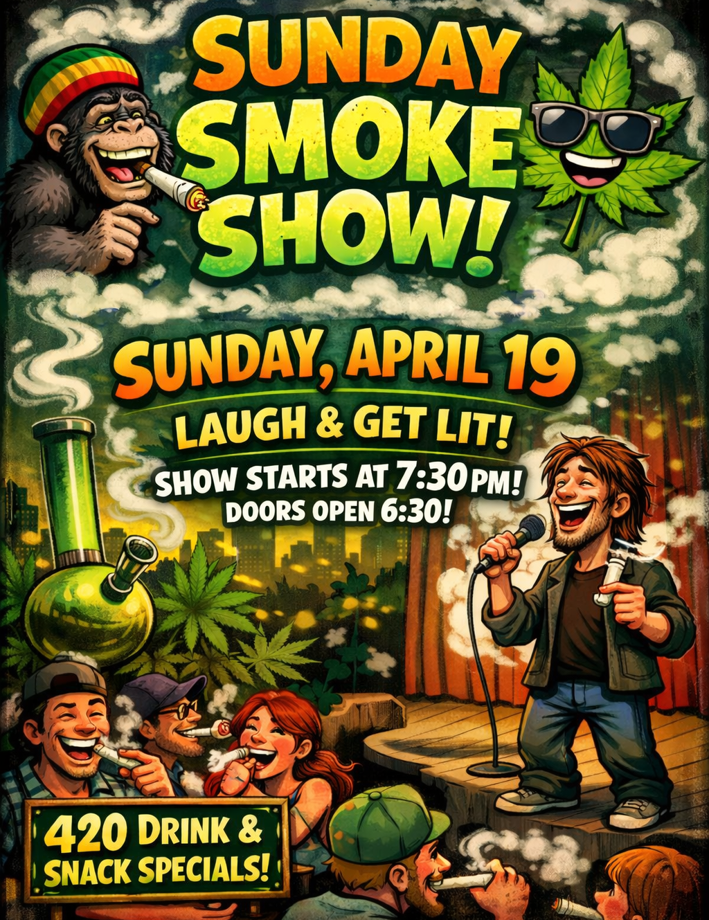 Special Sunday Smokehouse Comedy Show where the comics might be high⦠or they might just be that funny. You decide. The audience is the judge as comedians take the stage and try to keep it together.